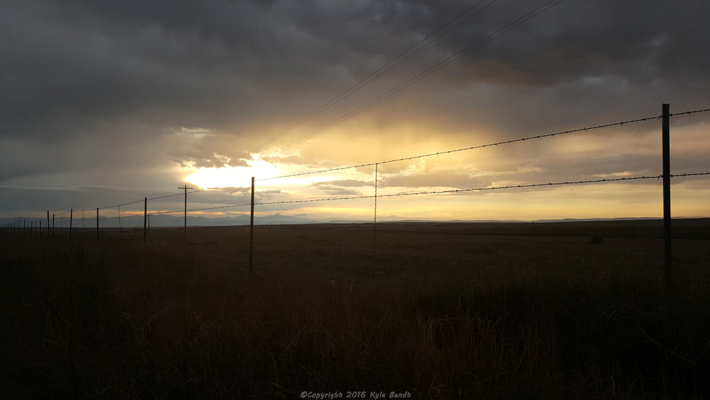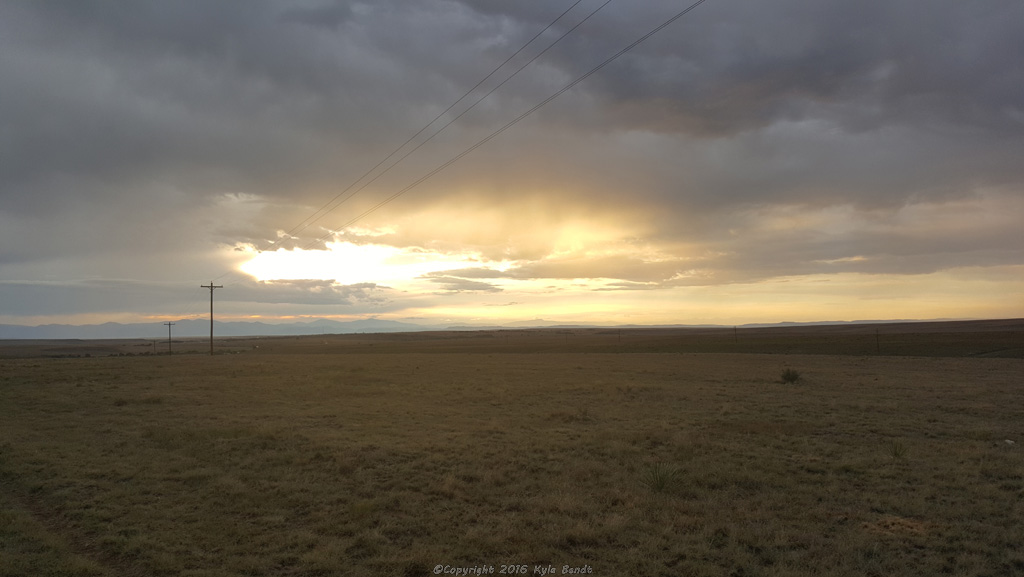 The landscape changed into gently rolling, grass-covered hills as I went further. It rained for an hour or so and I was happy to watch the little water drops. Later, it quit actually raining where I was, but I could see it raining around me. I watched lightening flashing in the distance ahead of me and to both sides. I watched the sun set, occasionally peaking through the clouds. The sky and landscape in some areas had that sort of dreamy, cloudy, pastel-like quality and I could see mountains silhouetted in the background.