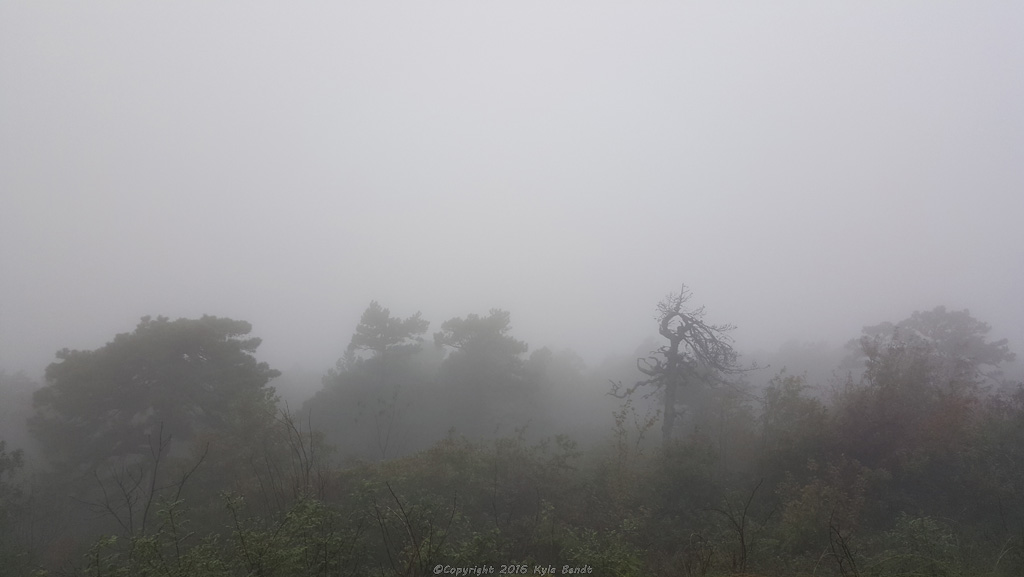 I pulled off on one of at one of the scenic vistas to take some pictures. It felt strange and isolating in the fog. I knew that if it weren’t foggy, there would be an expansive view but as it was, I could only see a very short distance. I studied the map a while and saw there was a dirt road tahead that I could turn off on and it looked hopeful for finding a camping spot.