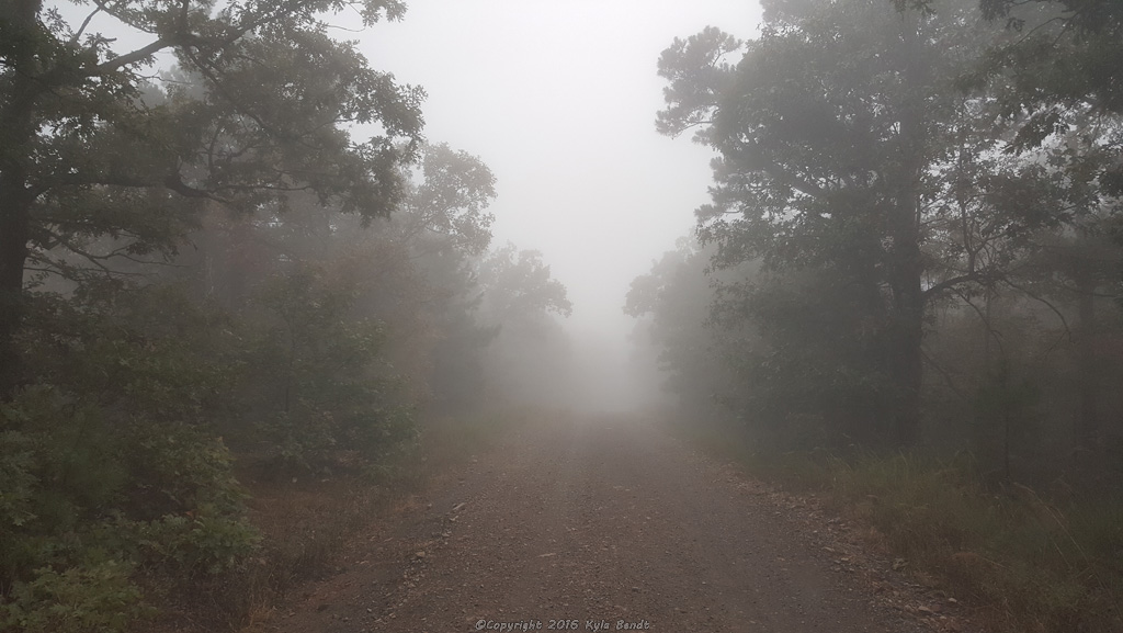 So I started driving up the Talimena Scenic drive. I quickly hit fog. Cool, blanketing, dense, encompassing fog. I took the road slowly, knowing I couldn’t see far. It was cool. I don’t know how often that area sees fog like that but my previous journey there had been on a clear day and I love how different weather and times of year change an area. One of the things I love about traveling to the same places again and again is the way they change and it’s never really the same place.