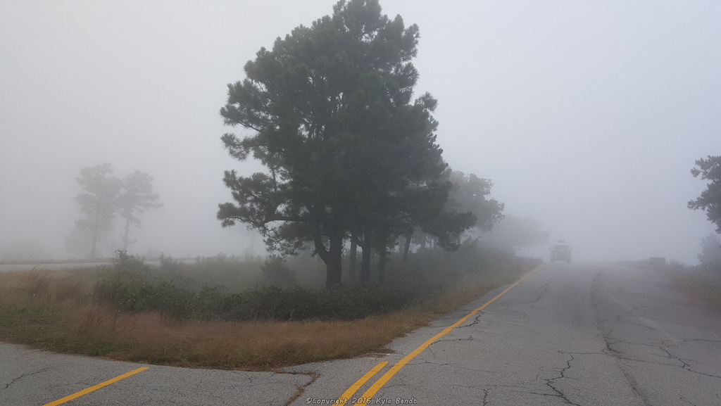So I started driving up the Talimena Scenic drive.  I quickly hit fog.  Cool, blanketing, dense, encompassing fog.  I took the road slowly, knowing I couldn’t see far.  It was cool.  I don’t know how often that area sees fog like that but my previous journey there had been on a clear day and I love how different weather and times of year change an area.  One of the things I love about traveling to the same places again and again is the way they change and it’s never really the same place.